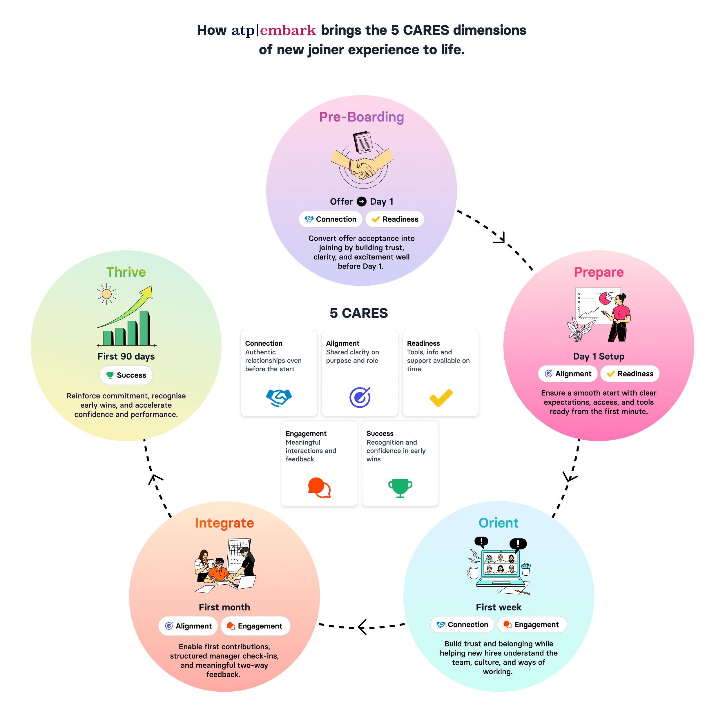Across the four onboarding phases – Prepare, Orient, Integrate, Thrive – new hires receive guided actions, early-win pathways, manager check-ins, and reflective prompts that speed up clarity, contribution, and belonging.